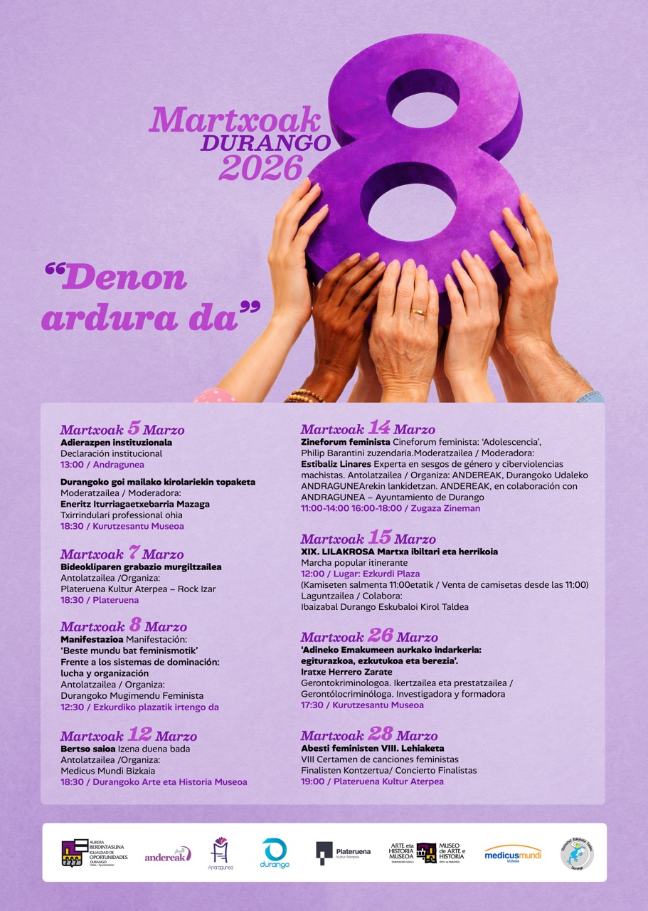M8: Durangoko Udalaren egitaraua 2 martxoa, 2026 | Albisteak, DBH, HH, LH Hementxe duzue Martxoaren 8rako Durangon antolatuko diren ekitaldien egitaraua.